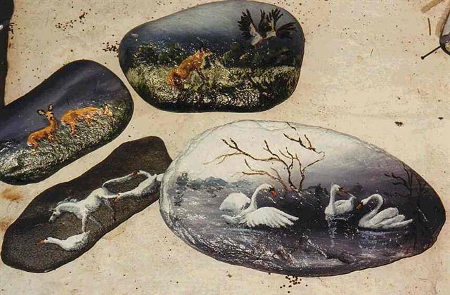 Dorothee Menzel malt auch auf Stein. Die hierzu besonders geeigneten flachen Steine wurden an der französischen Atlantikküste ausgesucht.